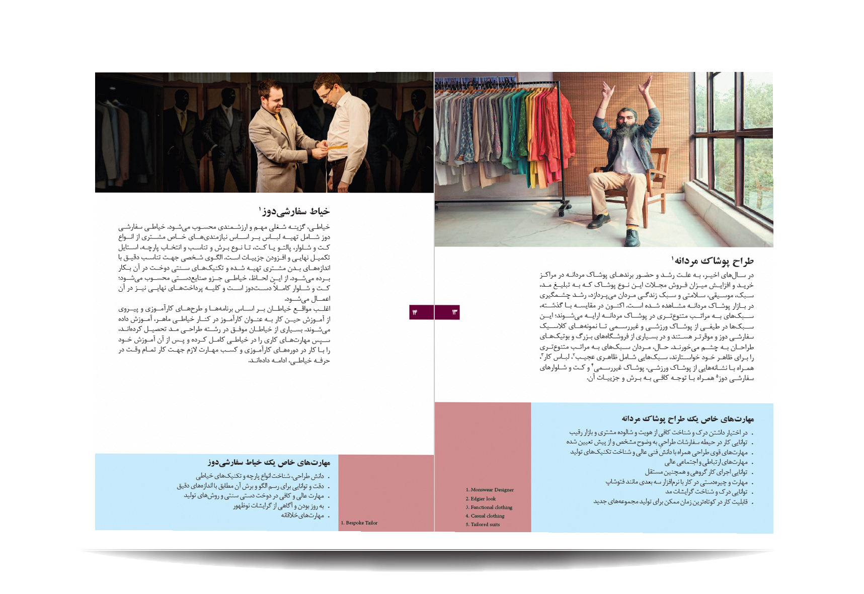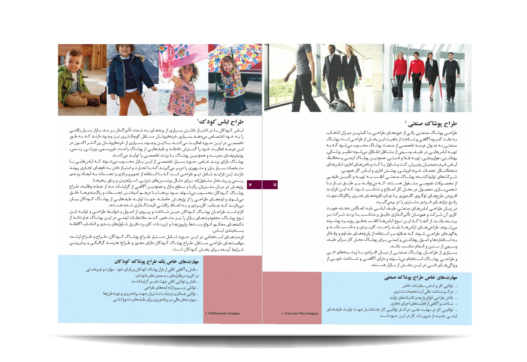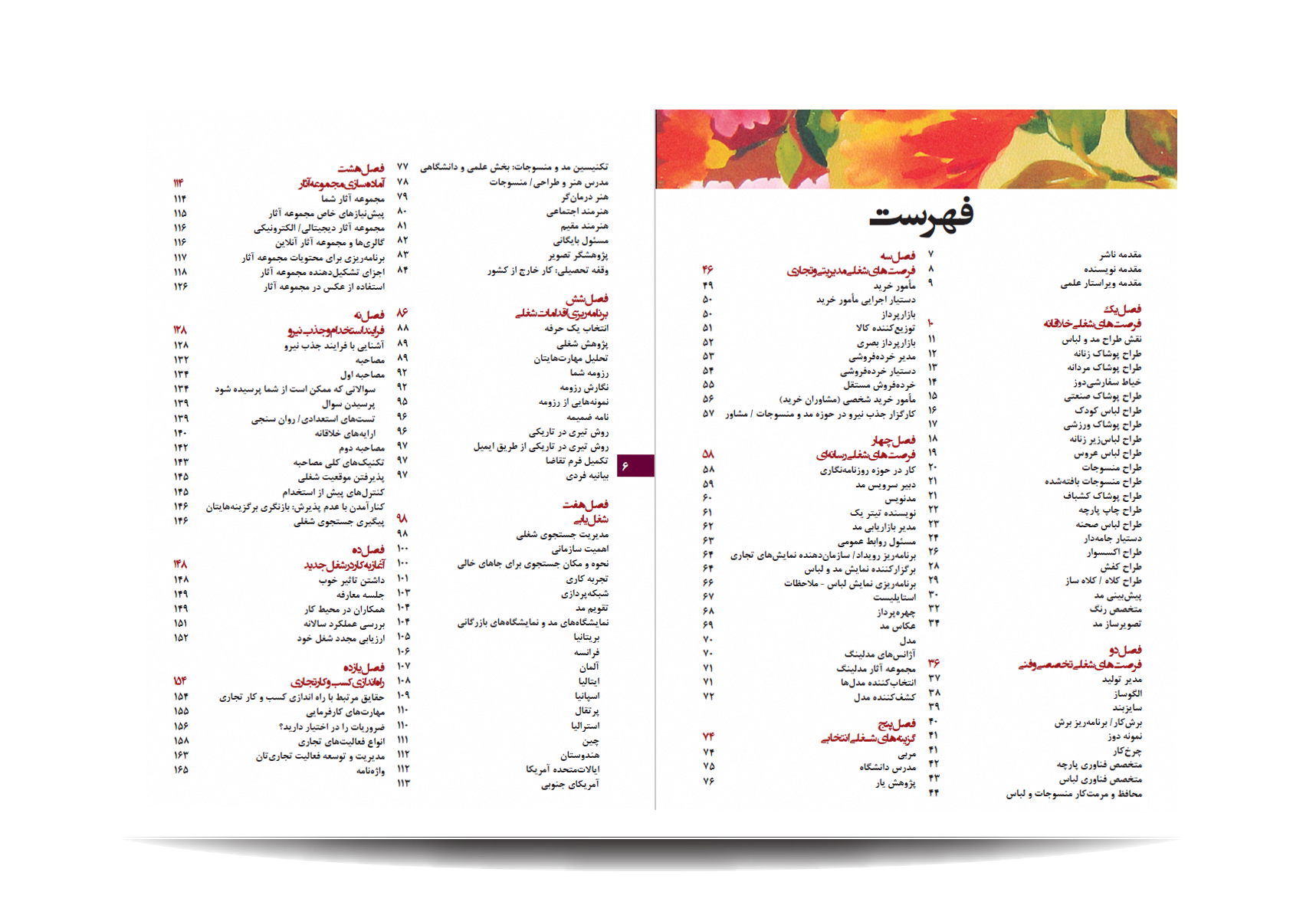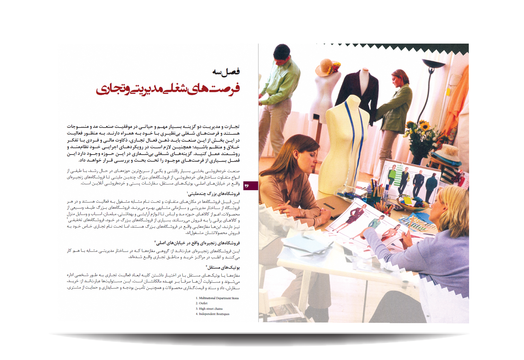 کتاب راهنمای مشاغل هنر صنعت پوشاک نوشته کارل بروان ترجمه منصوره نیکوکار توسط انتشارات جمال هنر به چاپ رسیده است.مباحث کتاب راهنمای مشاغل هنر صنعت پوشاک: فرصت های شغلی خلاقانه-فرضت های شغلی تخصصی و فنی-فرصت های شغلی مدیریتی و تجاری -فرصت های شغلی رسانه ای-گزینه های شغلی انتخابی برنامه ریزی- اقدامات شغلی-شغل یابی-آماده سازی مجموعه آثار فرایند استخدام و جذب نیرو-آغاز به کار در شغل جدید- راه اندازی کسب و کار تجاری