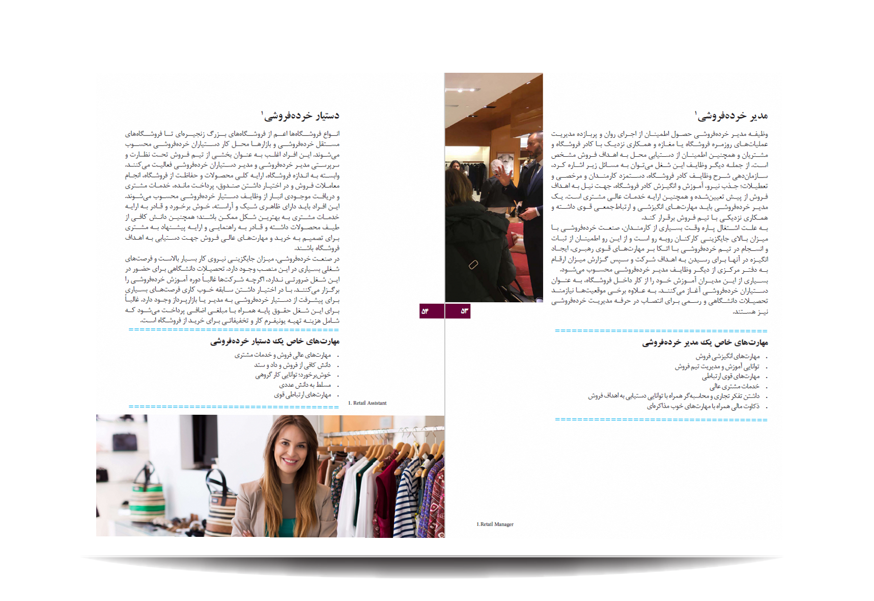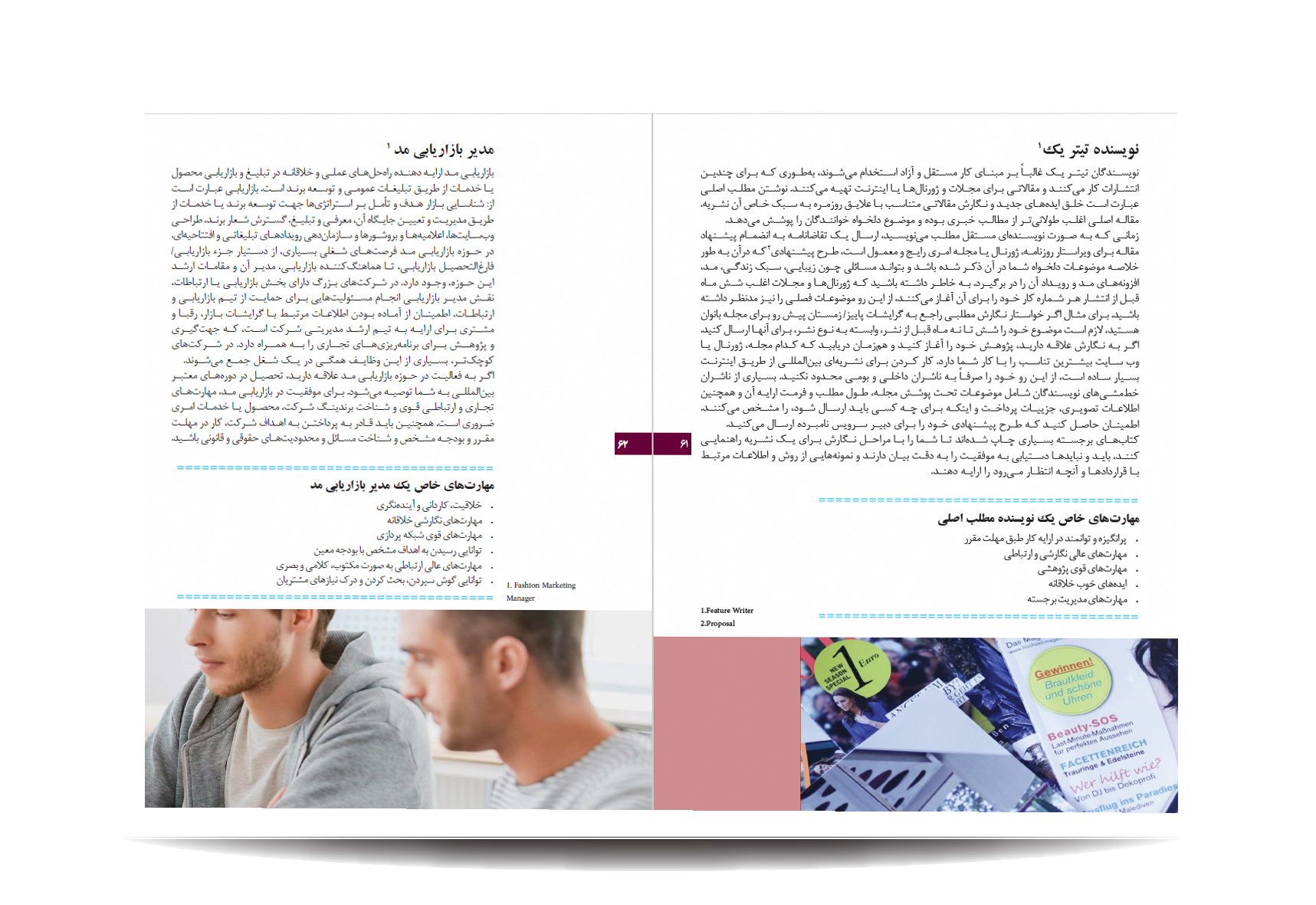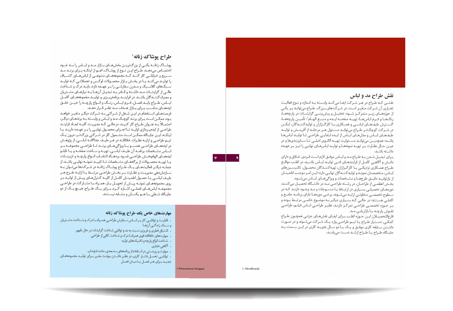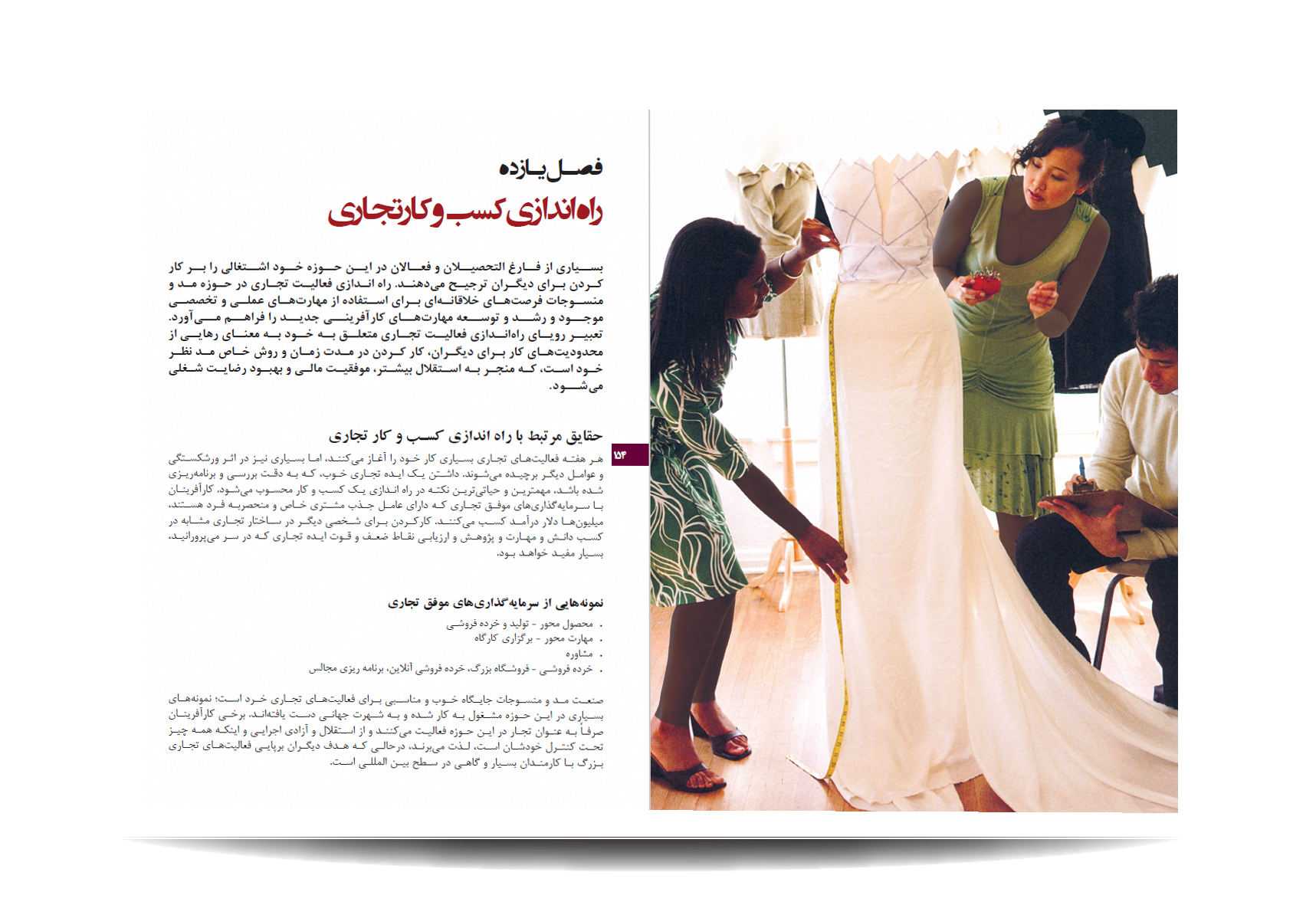 کتاب راهنمای مشاغل هنر صنعت پوشاک نوشته کارل بروان ترجمه منصوره نیکوکار توسط انتشارات جمال هنر به چاپ رسیده است.مباحث کتاب راهنمای مشاغل هنر صنعت پوشاک: فرصت های شغلی خلاقانه-فرضت های شغلی تخصصی و فنی-فرصت های شغلی مدیریتی و تجاری -فرصت های شغلی رسانه ای-گزینه های شغلی انتخابی برنامه ریزی- اقدامات شغلی-شغل یابی-آماده سازی مجموعه آثار فرایند استخدام و جذب نیرو-آغاز به کار در شغل جدید- راه اندازی کسب و کار تجاری