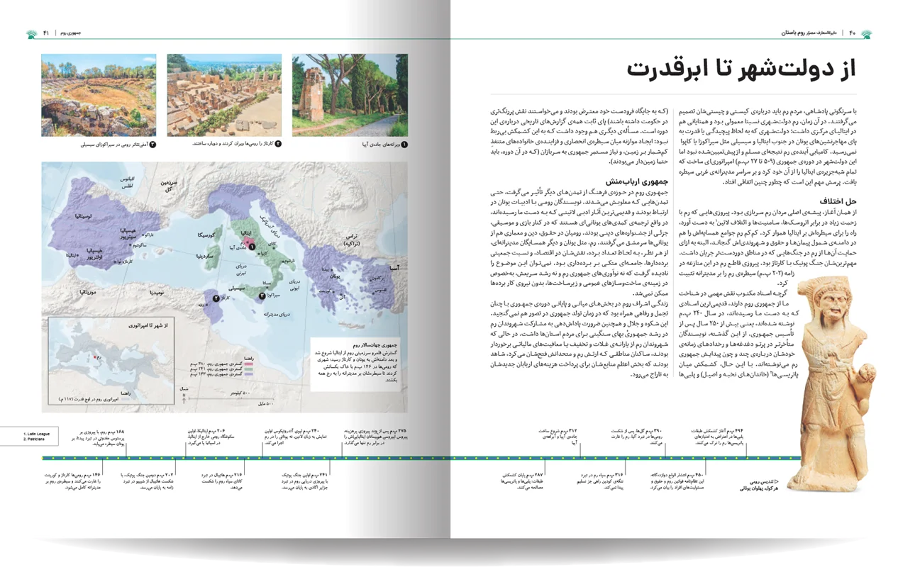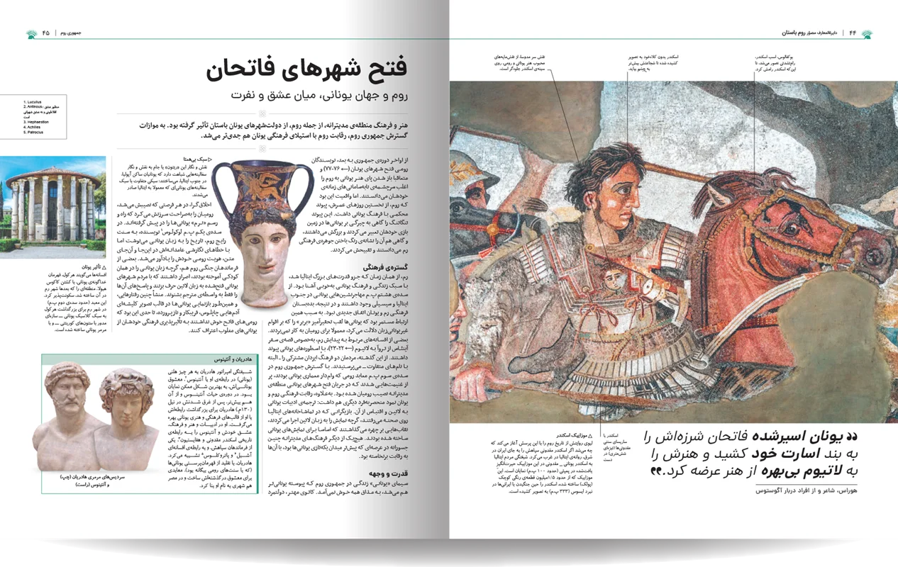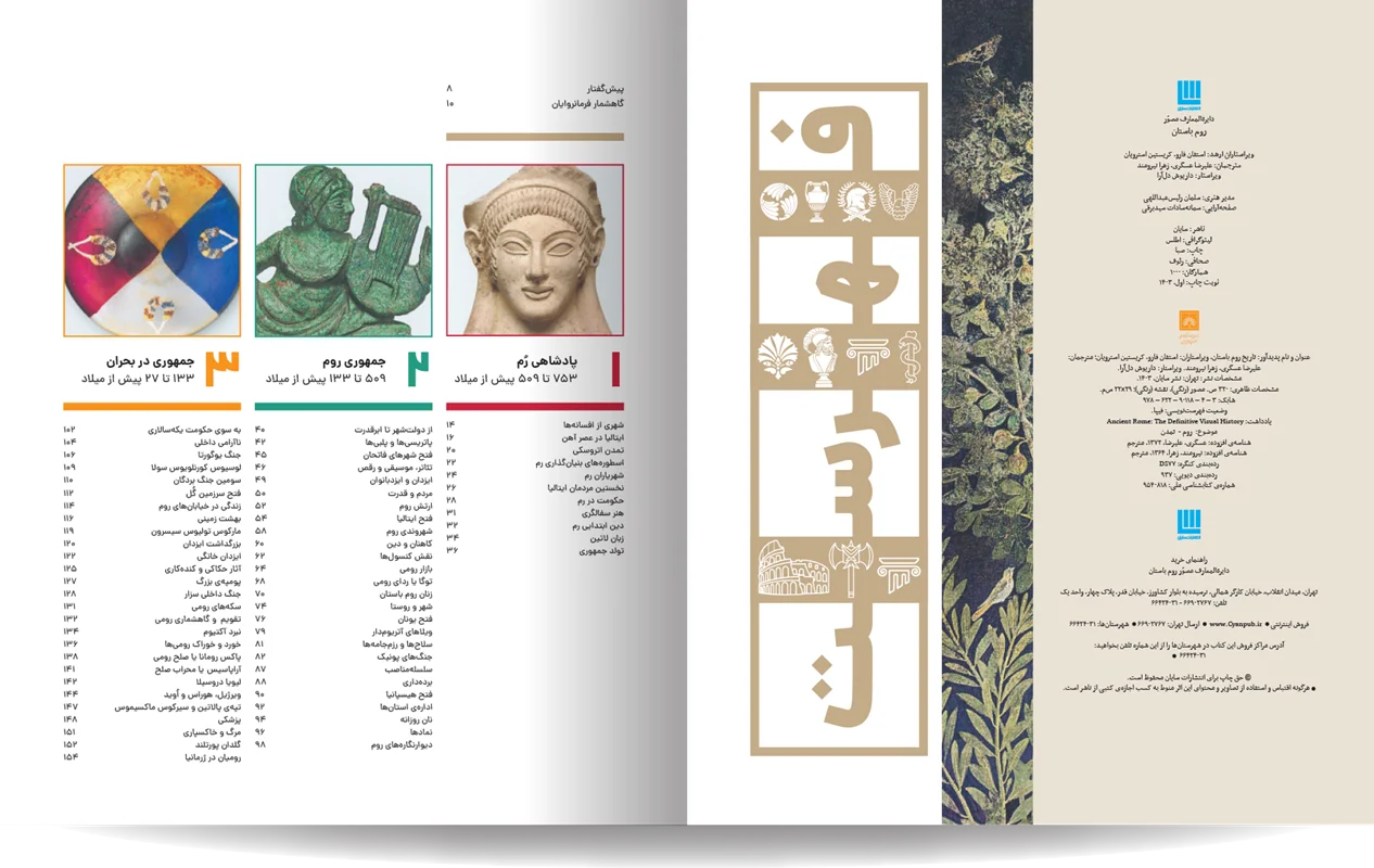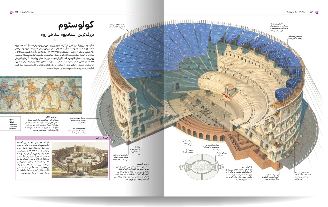 دایره المعارف مصور روم باستان، نوشته شده توسط جمعی از نویسندگان انتشارات دورلینگ کیندرزلی، یک اثر فوقالعاده و جامع در زمینه تاریخ روم باستان است. این کتاب با طراحی گرافیکی چشمنواز و عکسهای با کیفیت بالا، خوانندگان را به سفری شگفتانگیز در دنیای پر طمطراق امپراتوری روم باستان میبرد. نویسندگان این کتاب، با تسلط کامل بر موضوع و بهرهگیری از آخرین یافتههای باستانشناسی و تاریخی، توانستهاند جنبههای مختلف زندگی در روم باستان را به تصویر بکشند. از سیاست و نظامیگری گرفته تا هنر، معماری، و زندگی روزمره مردم، آب و هوا ، قدمت تاریخی شهر و سکونتگاه های اولیه. این کتاب همه چیز را با جزئیات و دقت بالا پوشش میدهد. نکته برجسته این کتاب، استفاده فراوان از تصاویر و عکسهای با کیفیت است. بیش از 1000 تصویر رنگی، شامل عکسهایی از اثار بجا مانده همچون مجمسمه ها، موزاییک، قلعه ها و غیره، بازسازیهای گرافیکی، و نقشهها، به خوانندگان کمک میکنند تا درک کامل تری از شیوه زندگی در روم باستان داشته باشند.