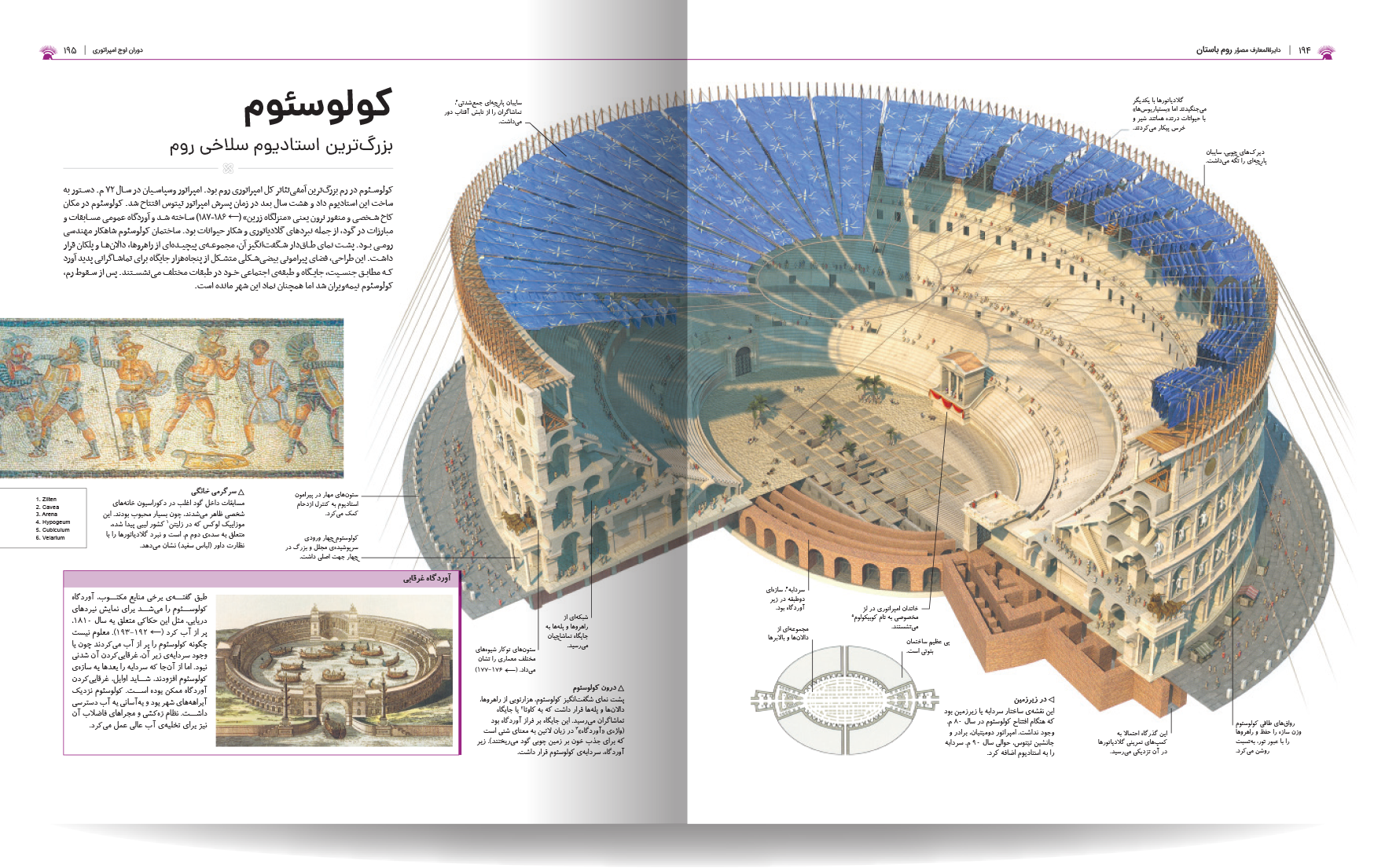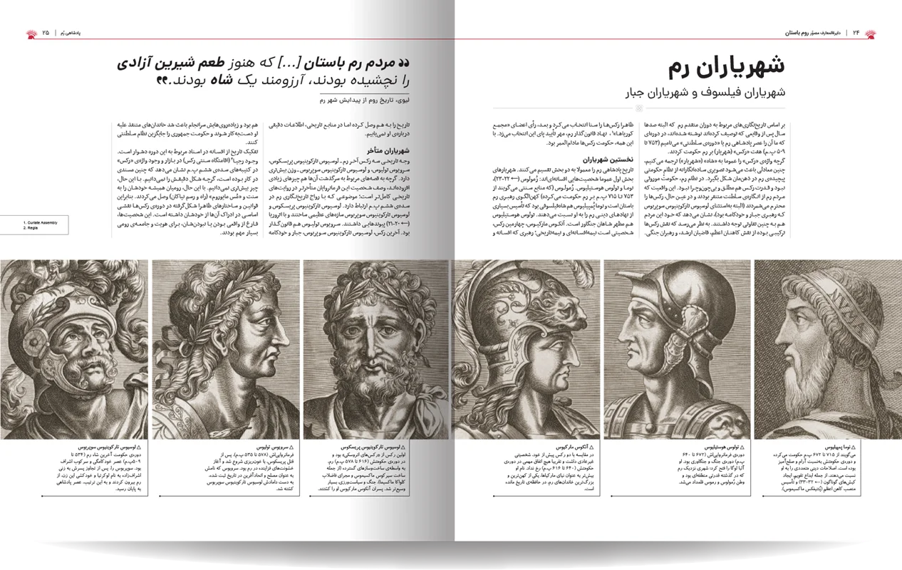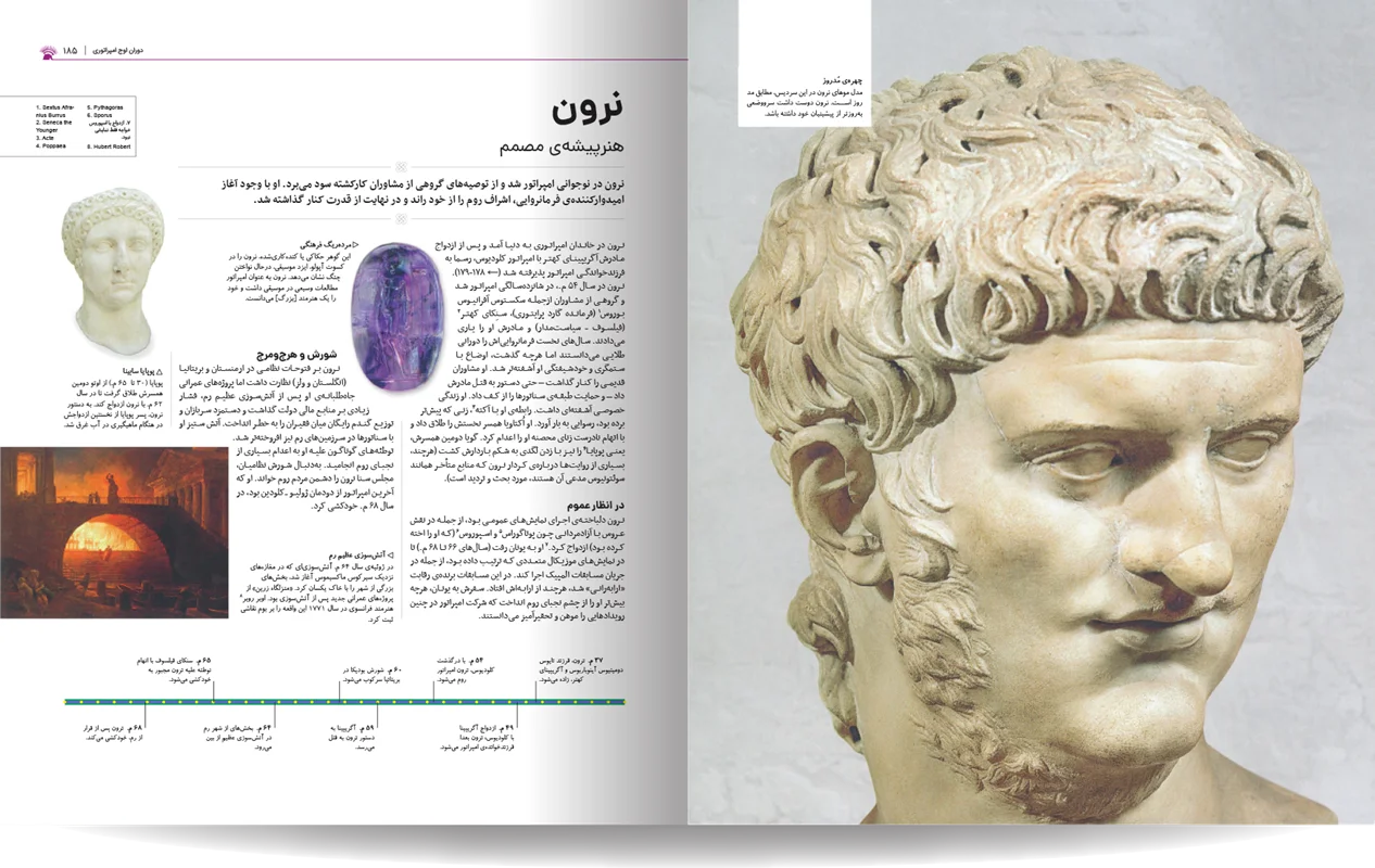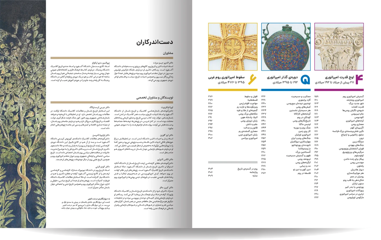 دایره المعارف مصور روم باستان، نوشته شده توسط جمعی از نویسندگان انتشارات دورلینگ کیندرزلی، یک اثر فوقالعاده و جامع در زمینه تاریخ روم باستان است. این کتاب با طراحی گرافیکی چشمنواز و عکسهای با کیفیت بالا، خوانندگان را به سفری شگفتانگیز در دنیای پر طمطراق امپراتوری روم باستان میبرد. نویسندگان این کتاب، با تسلط کامل بر موضوع و بهرهگیری از آخرین یافتههای باستانشناسی و تاریخی، توانستهاند جنبههای مختلف زندگی در روم باستان را به تصویر بکشند. از سیاست و نظامیگری گرفته تا هنر، معماری، و زندگی روزمره مردم، آب و هوا ، قدمت تاریخی شهر و سکونتگاه های اولیه. این کتاب همه چیز را با جزئیات و دقت بالا پوشش میدهد. نکته برجسته این کتاب، استفاده فراوان از تصاویر و عکسهای با کیفیت است. بیش از 1000 تصویر رنگی، شامل عکسهایی از اثار بجا مانده همچون مجمسمه ها، موزاییک، قلعه ها و غیره، بازسازیهای گرافیکی، و نقشهها، به خوانندگان کمک میکنند تا درک کامل تری از شیوه زندگی در روم باستان داشته باشند.