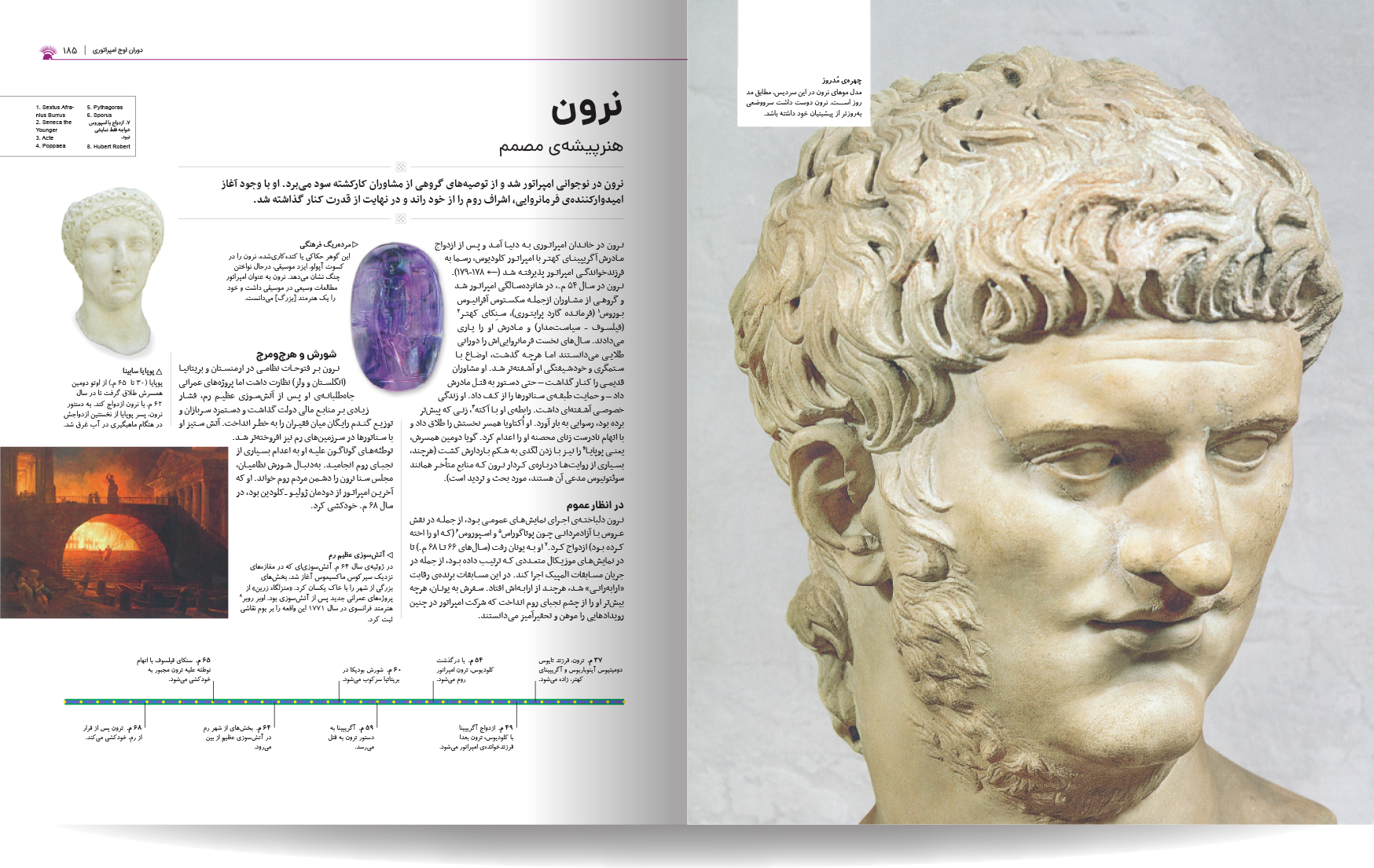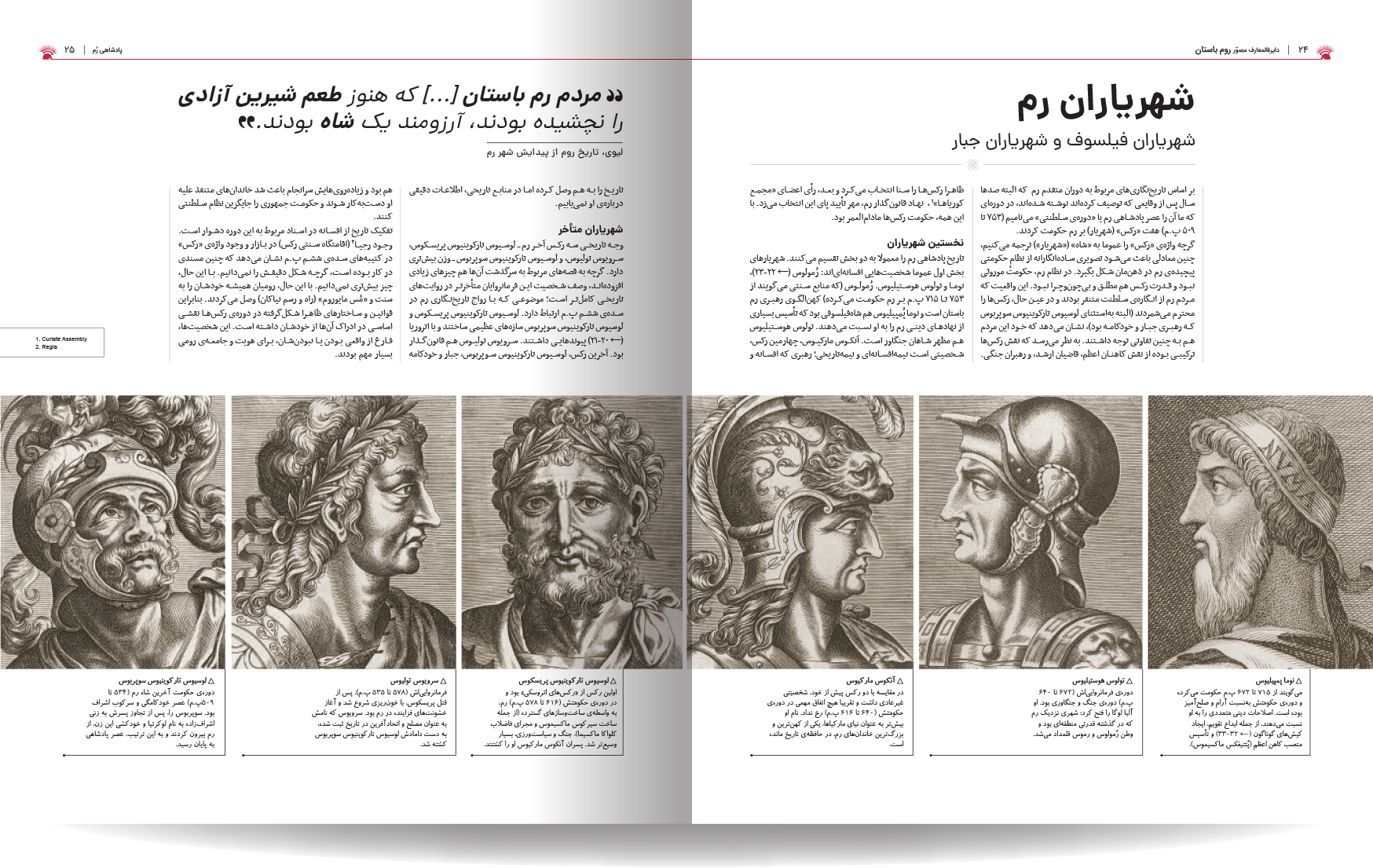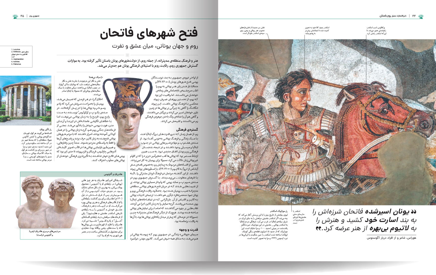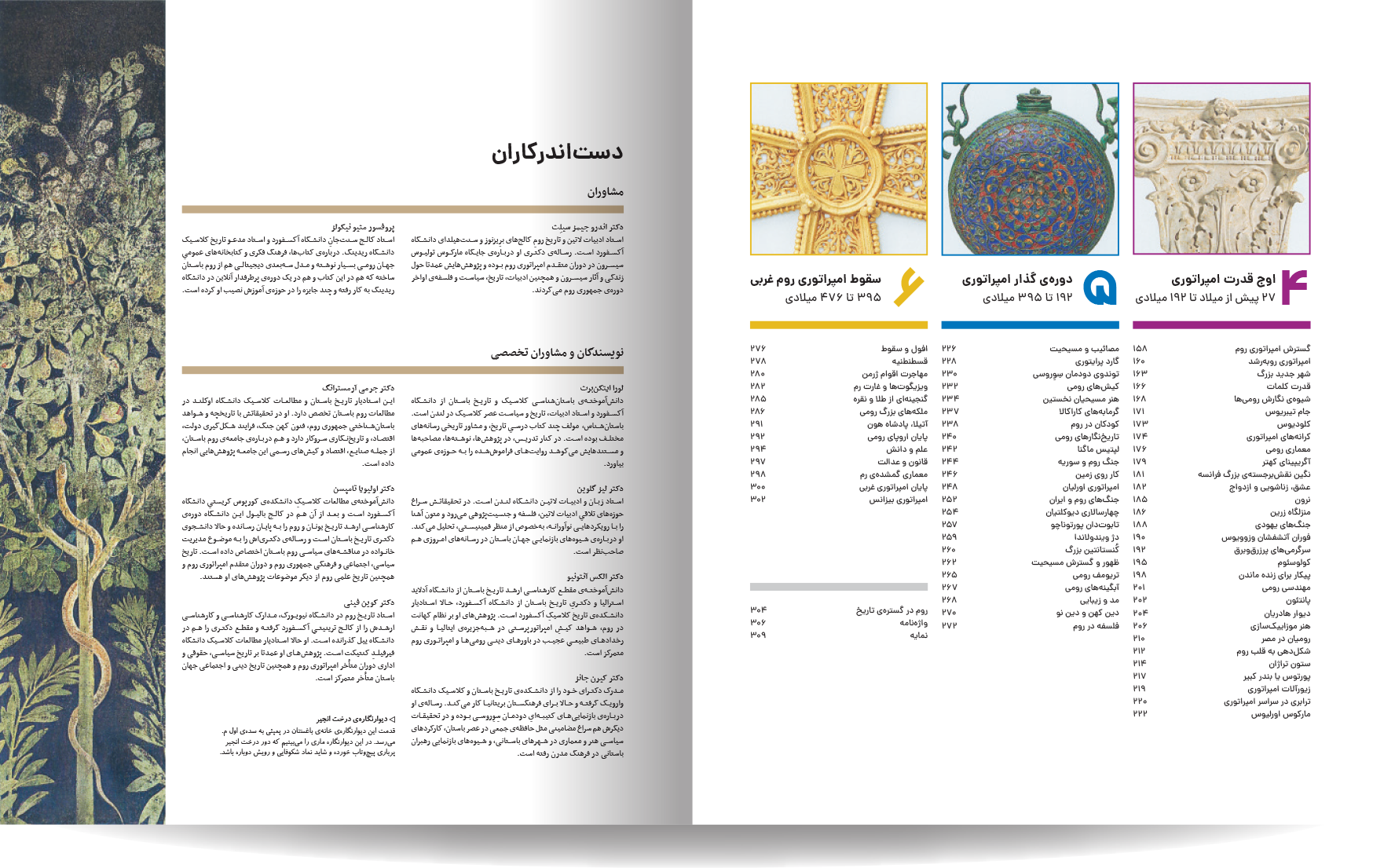 دایره المعارف مصور روم باستان، نوشته شده توسط جمعی از نویسندگان انتشارات دورلینگ کیندرزلی، یک اثر فوقالعاده و جامع در زمینه تاریخ روم باستان است. این کتاب با طراحی گرافیکی چشمنواز و عکسهای با کیفیت بالا، خوانندگان را به سفری شگفتانگیز در دنیای پر طمطراق امپراتوری روم باستان میبرد. نویسندگان این کتاب، با تسلط کامل بر موضوع و بهرهگیری از آخرین یافتههای باستانشناسی و تاریخی، توانستهاند جنبههای مختلف زندگی در روم باستان را به تصویر بکشند. از سیاست و نظامیگری گرفته تا هنر، معماری، و زندگی روزمره مردم، آب و هوا ، قدمت تاریخی شهر و سکونتگاه های اولیه. این کتاب همه چیز را با جزئیات و دقت بالا پوشش میدهد. نکته برجسته این کتاب، استفاده فراوان از تصاویر و عکسهای با کیفیت است. بیش از 1000 تصویر رنگی، شامل عکسهایی از اثار بجا مانده همچون مجمسمه ها، موزاییک، قلعه ها و غیره، بازسازیهای گرافیکی، و نقشهها، به خوانندگان کمک میکنند تا درک کامل تری از شیوه زندگی در روم باستان داشته باشند.