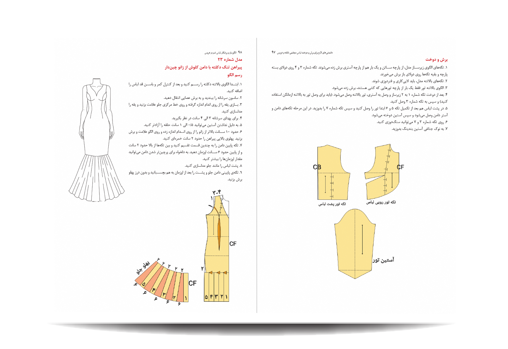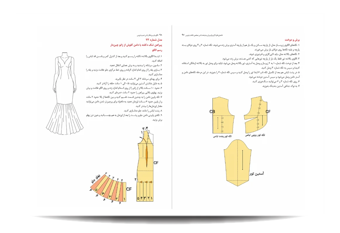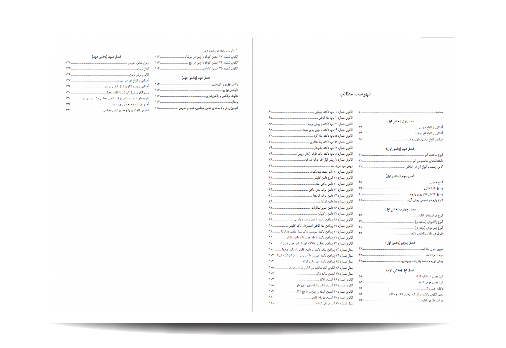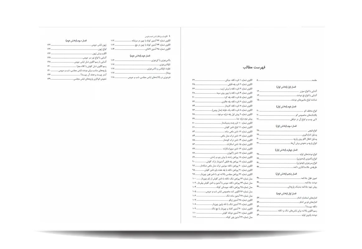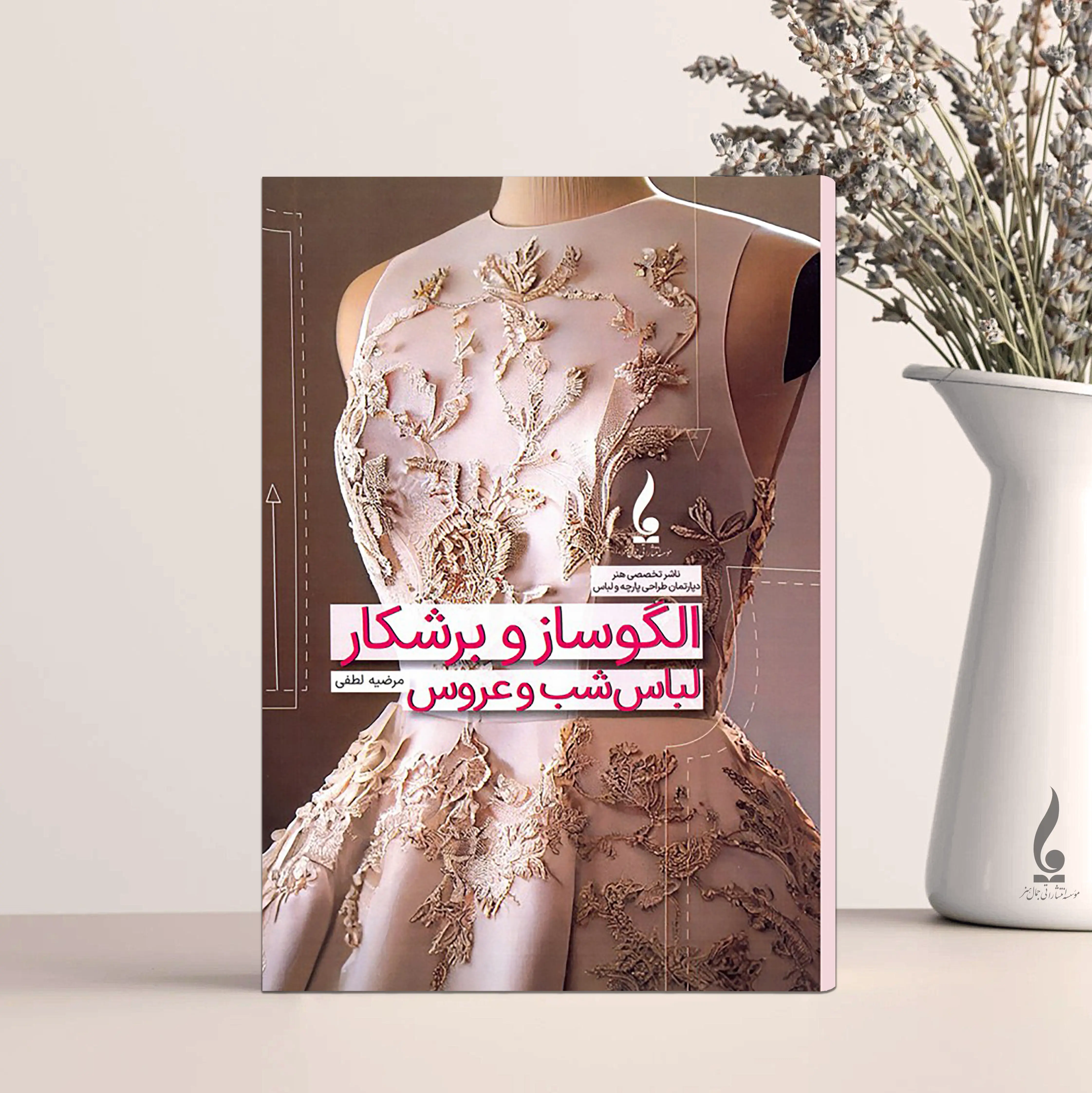 مباحث کتاب الگوساز و برشکار لباس شب و عروس: آشنایی با انواع سوزن-آشنایی با انواع نخ- دوخت-انواع ماشینهای دوخت-انواه مختلف اتو-بالشتکهای مخصوص اتو-لایی چسب و انواع آن در خیاطی-انواع قیچی-وسایل اندازهگیری-وسایل انتقال الگو روی پارچه-انواع پارچه و نحوه برش آنها-انواع دوخت اولیه-انواع پاکدوزی (لبه دوزی)-انواع پس دوزی (تودوزی)-طریقهی علامتگذاری دکمه-اندازههای طول جادکمه-دوخت جادکمه-روش تهیه جادکمه بندینک پارچهای