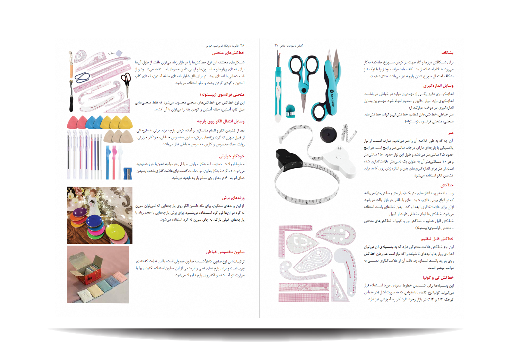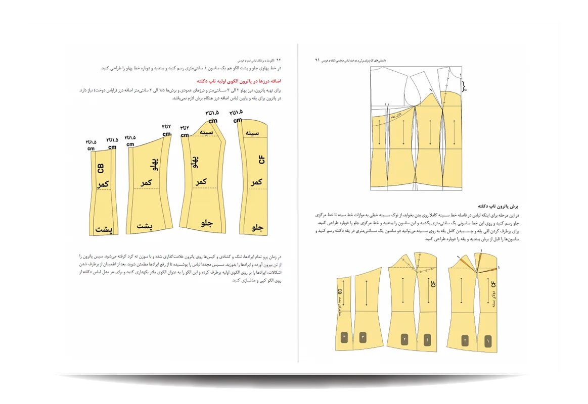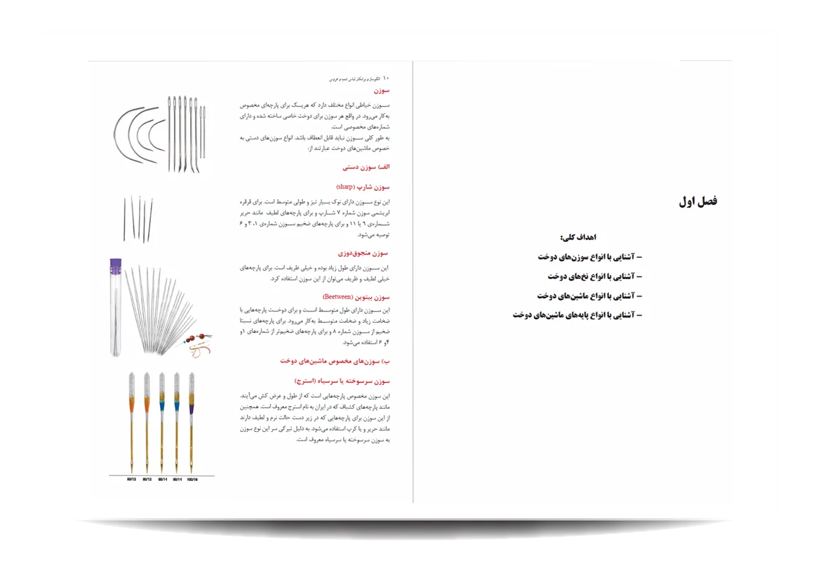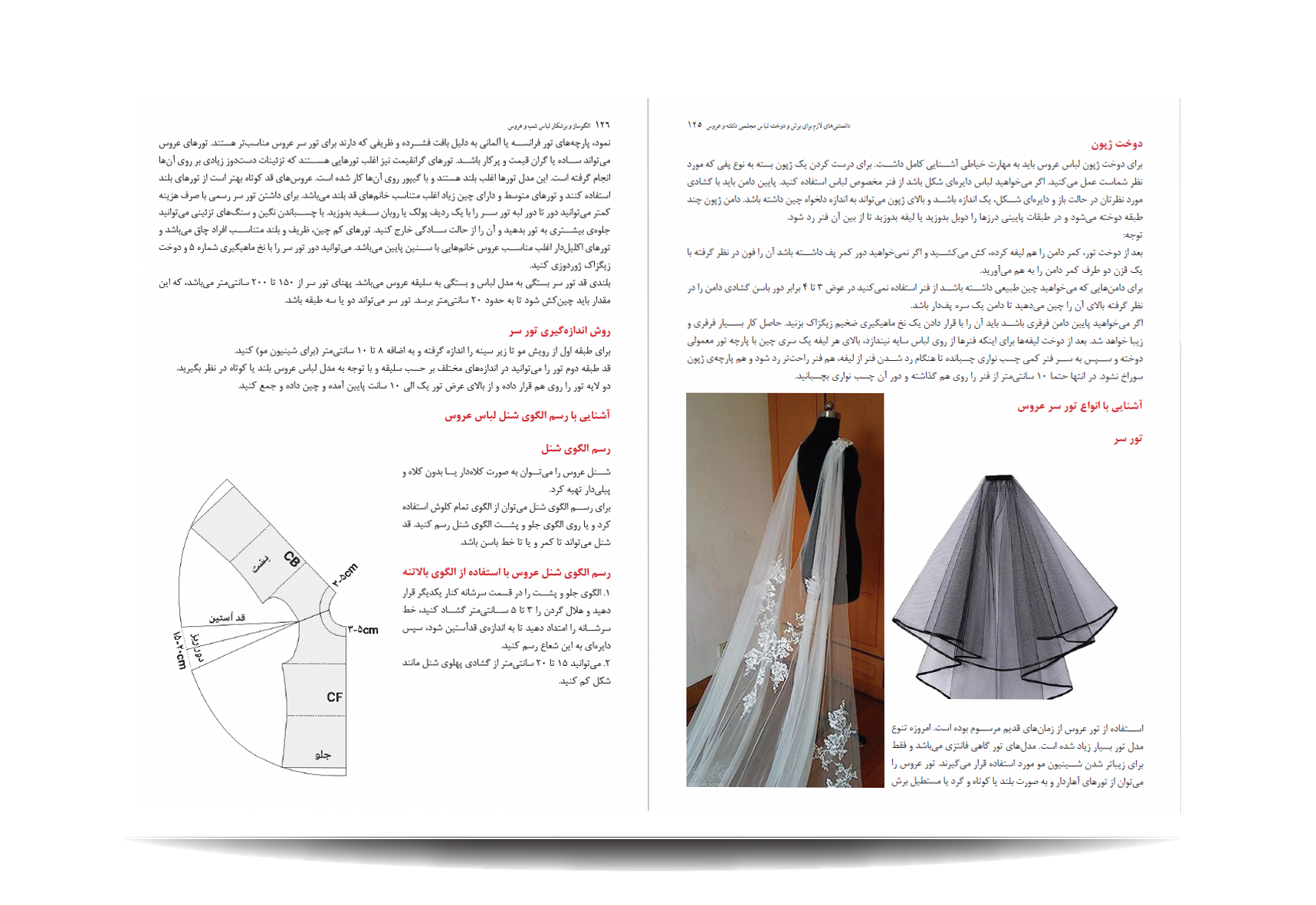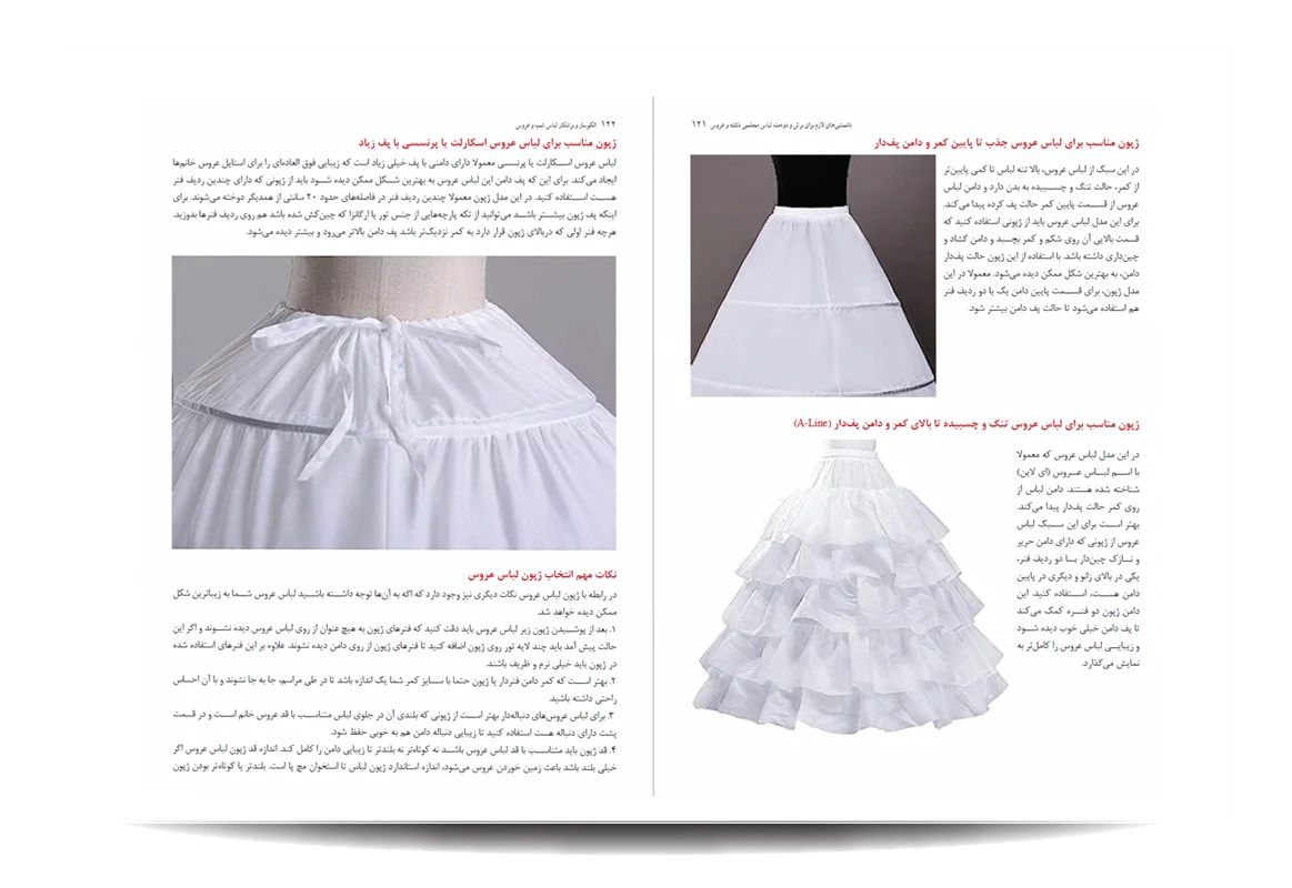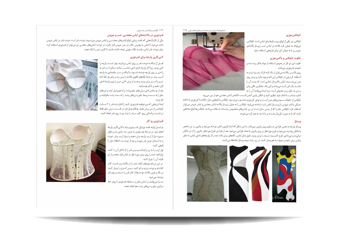 مباحث کتاب الگوساز و برشکار لباس شب و عروس: آشنایی با انواع سوزن-آشنایی با انواع نخ- دوخت-انواع ماشینهای دوخت-انواه مختلف اتو-بالشتکهای مخصوص اتو-لایی چسب و انواع آن در خیاطی-انواع قیچی-وسایل اندازهگیری-وسایل انتقال الگو روی پارچه-انواع پارچه و نحوه برش آنها-انواع دوخت اولیه-انواع پاکدوزی (لبه دوزی)-انواع پس دوزی (تودوزی)-طریقهی علامتگذاری دکمه-اندازههای طول جادکمه-دوخت جادکمه-روش تهیه جادکمه بندینک پارچهای