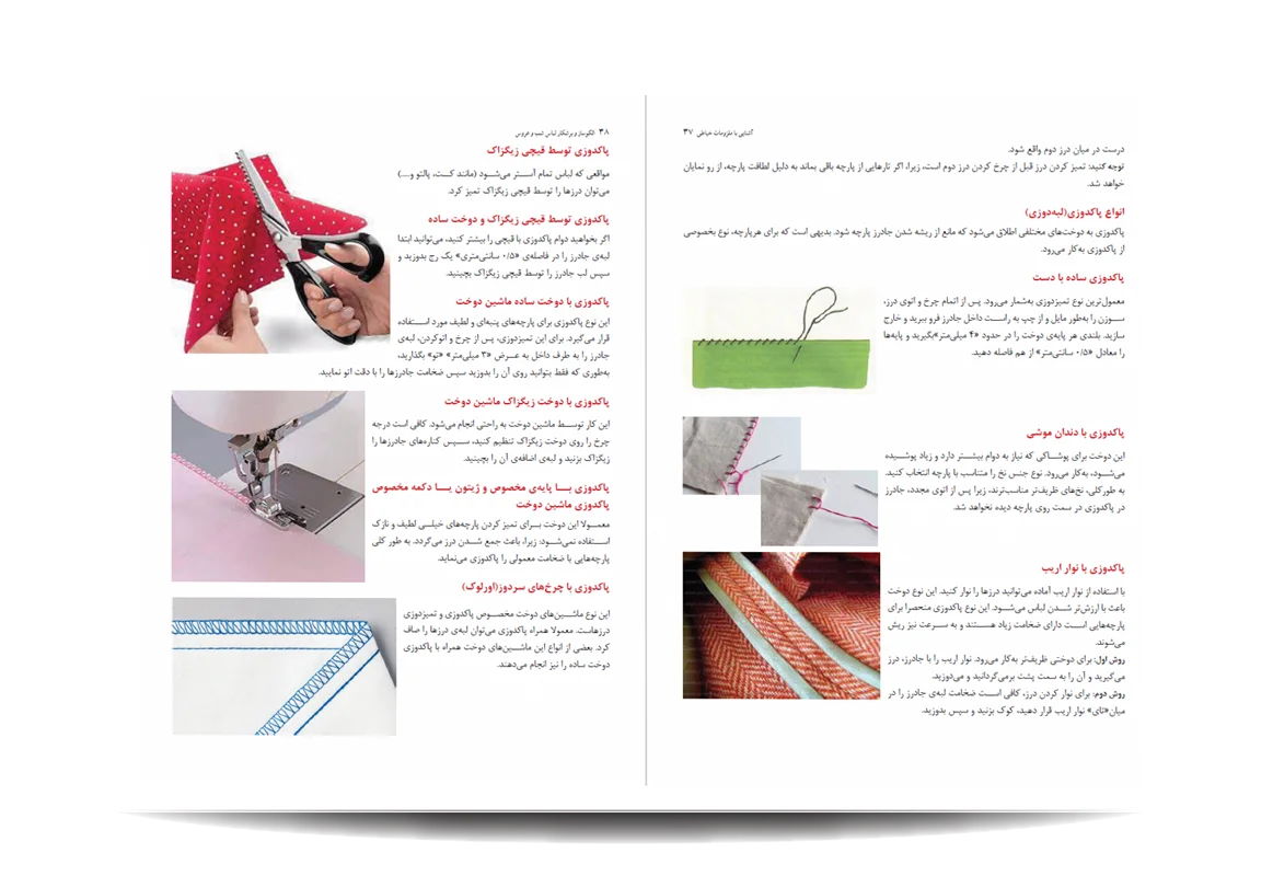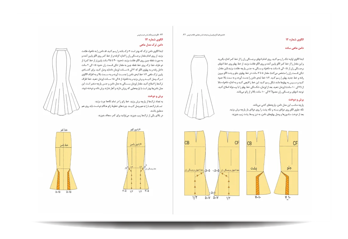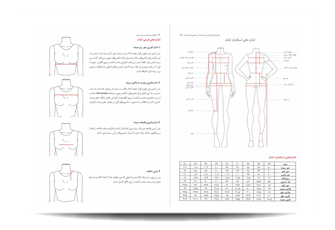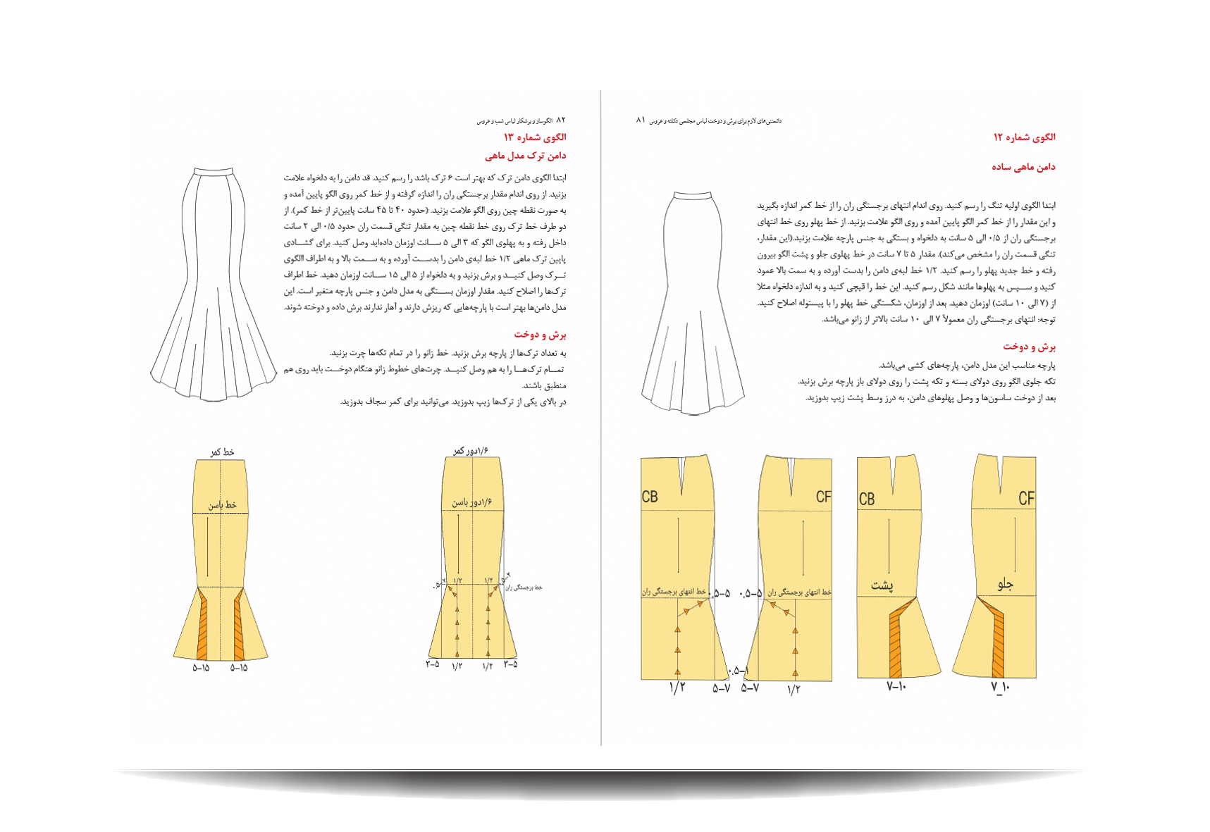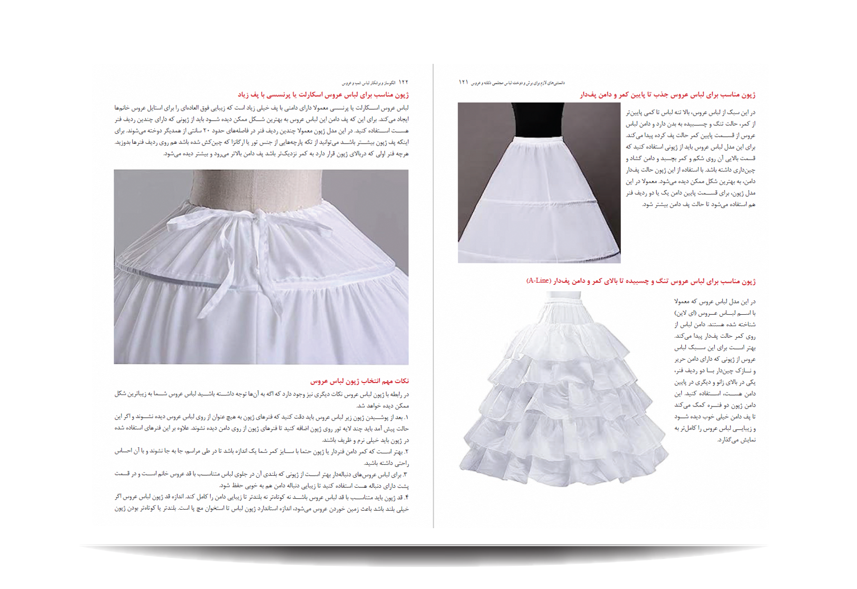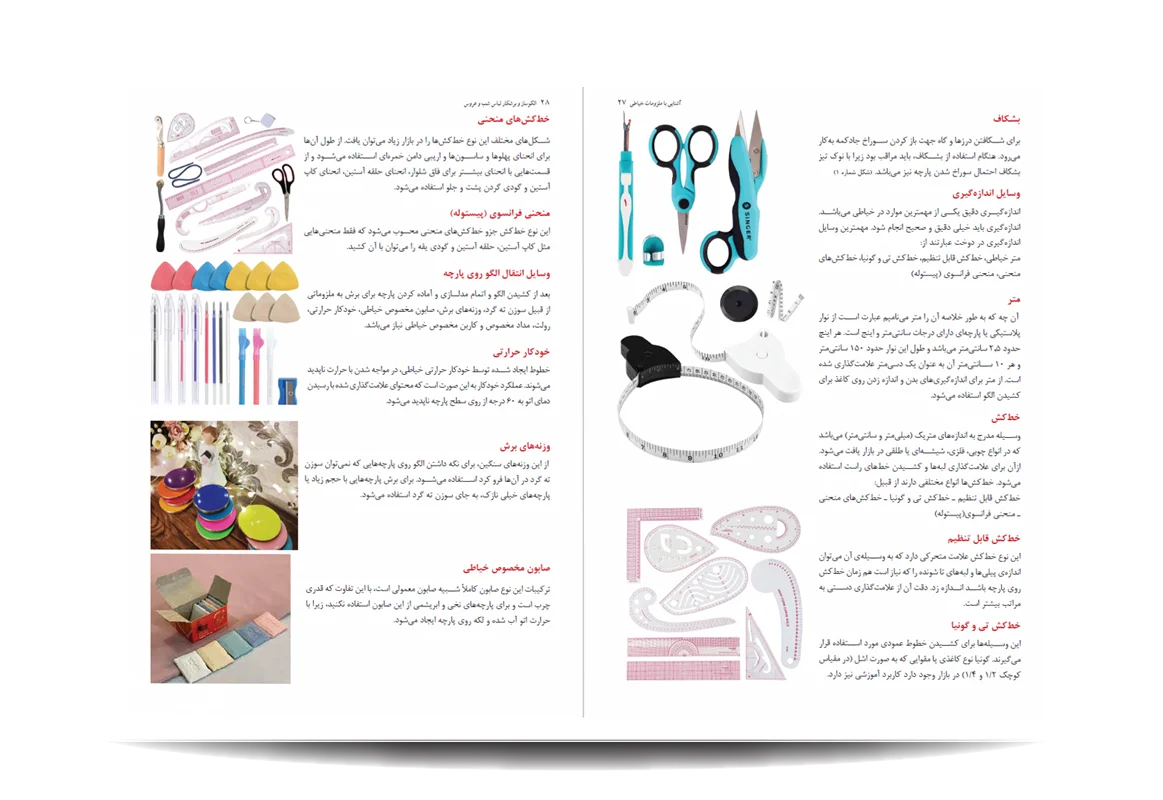 مباحث کتاب الگوساز و برشکار لباس شب و عروس: آشنایی با انواع سوزن-آشنایی با انواع نخ- دوخت-انواع ماشینهای دوخت-انواه مختلف اتو-بالشتکهای مخصوص اتو-لایی چسب و انواع آن در خیاطی-انواع قیچی-وسایل اندازهگیری-وسایل انتقال الگو روی پارچه-انواع پارچه و نحوه برش آنها-انواع دوخت اولیه-انواع پاکدوزی (لبه دوزی)-انواع پس دوزی (تودوزی)-طریقهی علامتگذاری دکمه-اندازههای طول جادکمه-دوخت جادکمه-روش تهیه جادکمه بندینک پارچهای