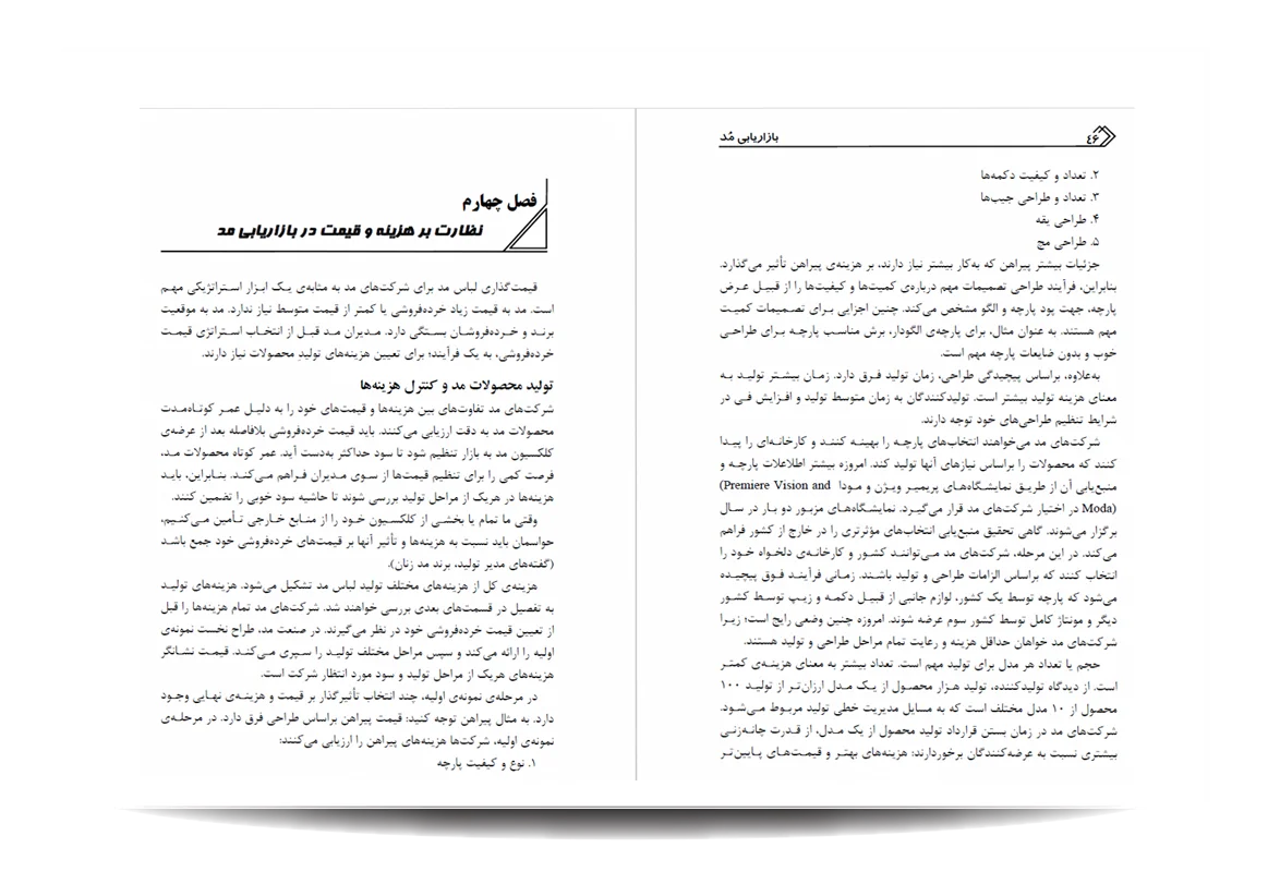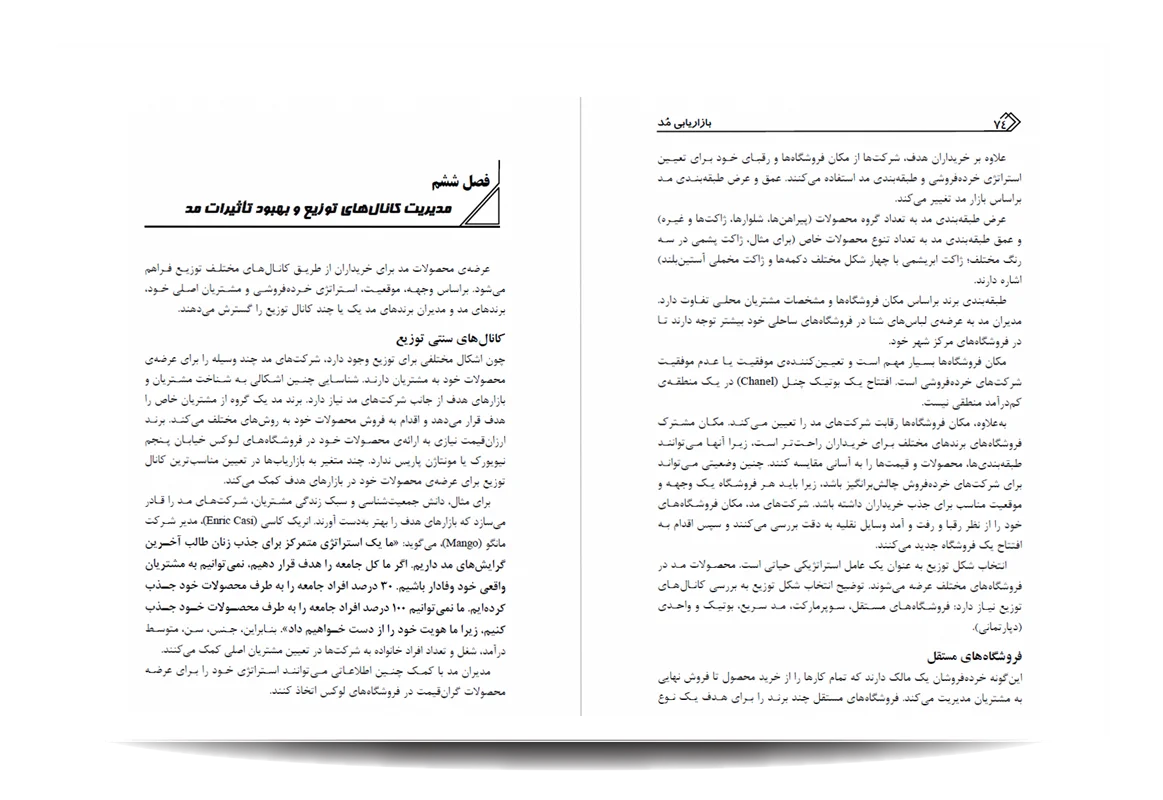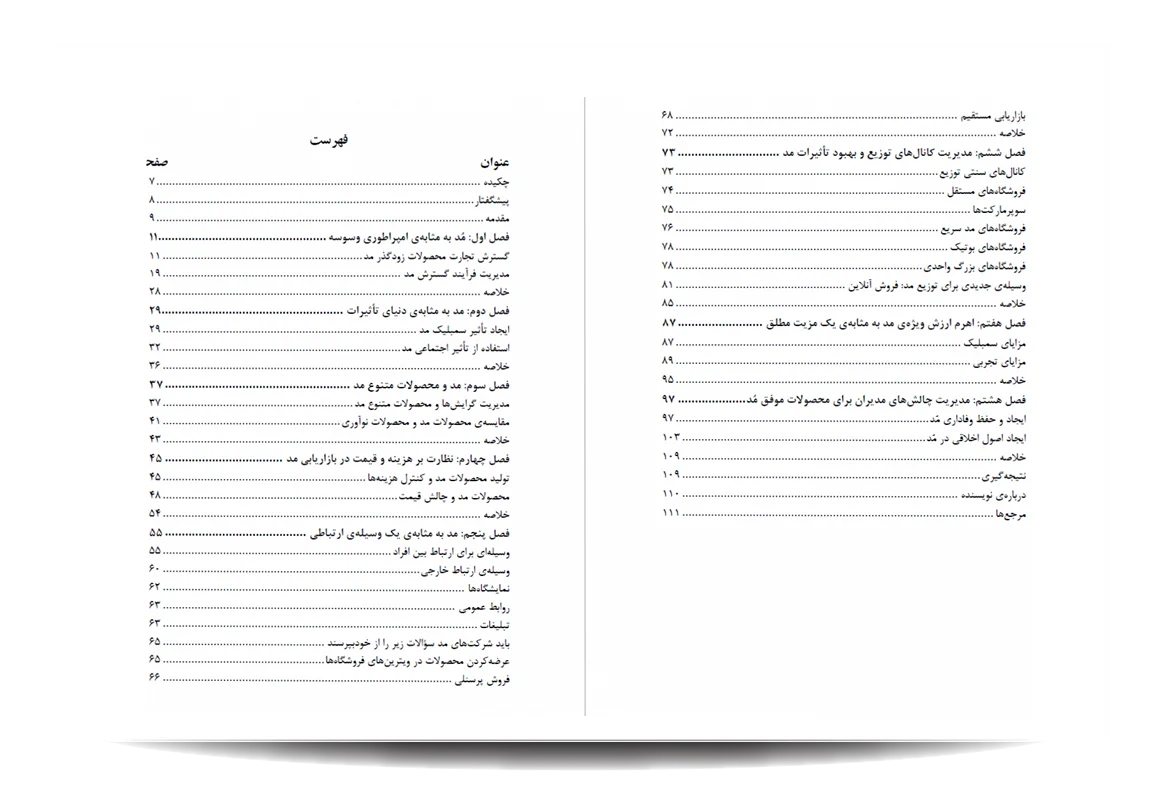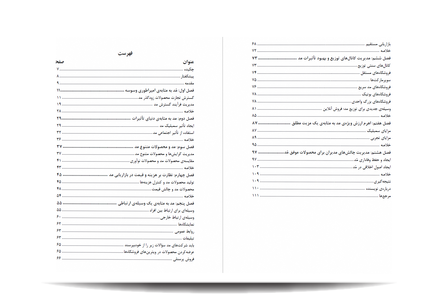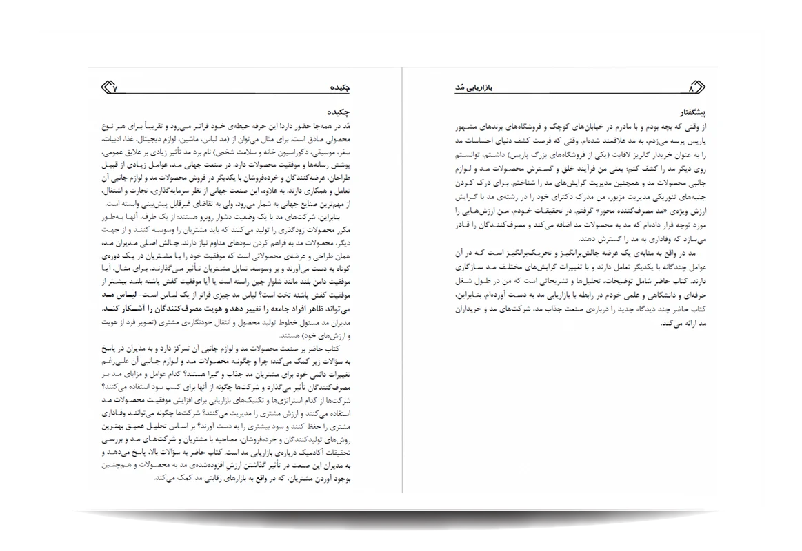 کتاب بازاریابی مد به مدیران براساس آخرین تحقیقات بازاریابی مد، دیدگاههای شرکت مد، بهترین روشها و الگوها و مصاحبه با مصرفکنندگان مد، در تاثیرگذاشتن بر ارزش افزوده مد به محصولات و خلق مشتریان وفادار در بازار رقابتی مد کمک میکند.مباحث کتاب بازاریابی مد بیشتر بفروشید: مد به مثابه ی امیپراطوری وسوسه -مد به مثابه ی دنیای تاثیرات-مد و محصولات متنوع مد-نظارت بر هزینه و قیمت در بازاریابی مد-مد مثابه یک وسیله ی ارتباطی-مدیریت کانال های توزیع و بهبود تاثیرات مد-اهرم ارزش ویژه ی مد به مثابه یک مزیت مطلق