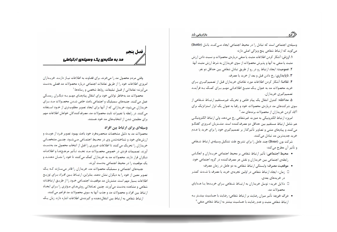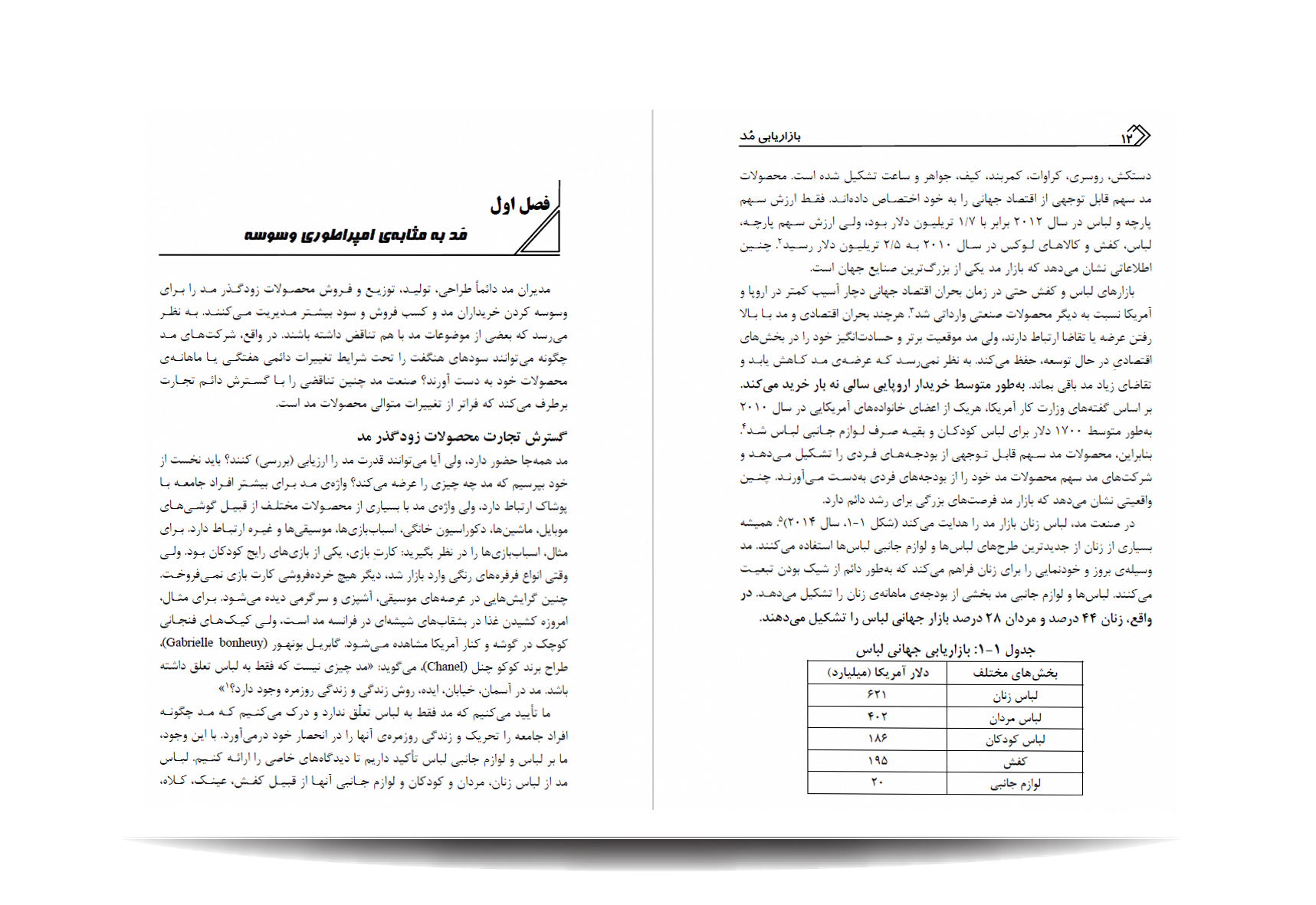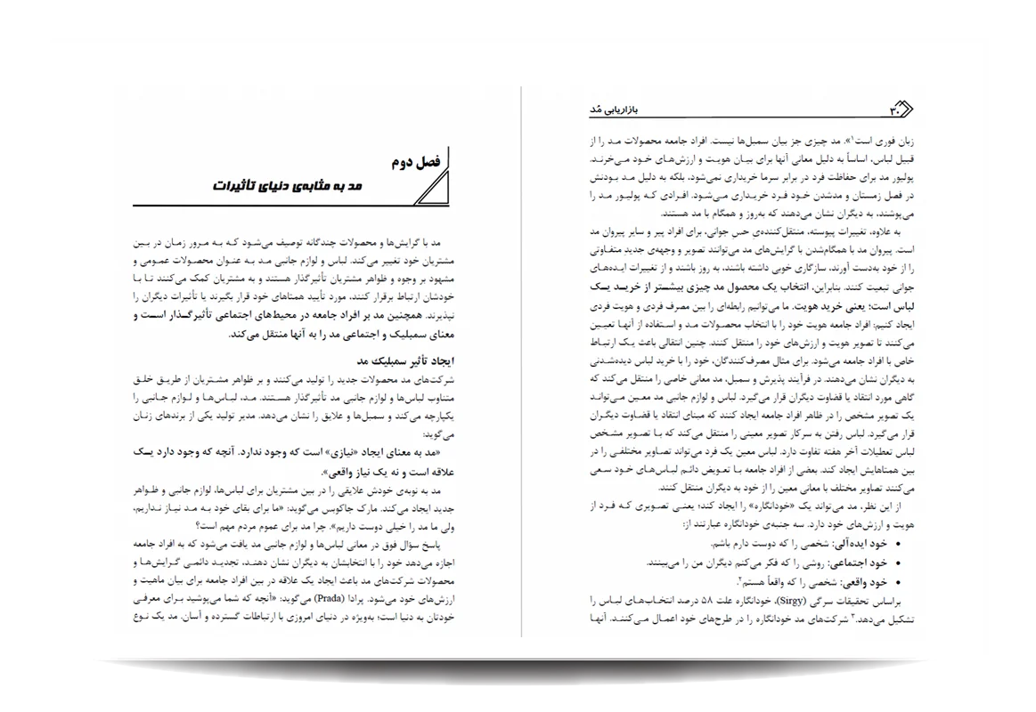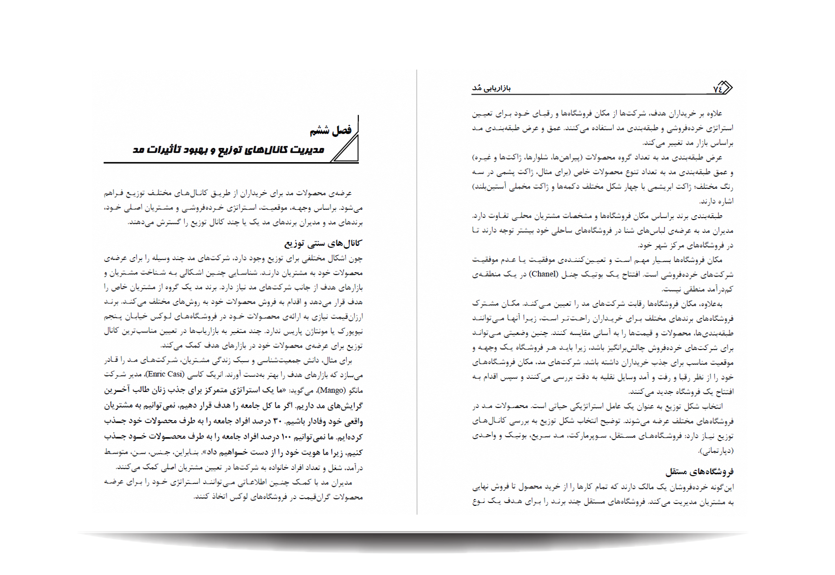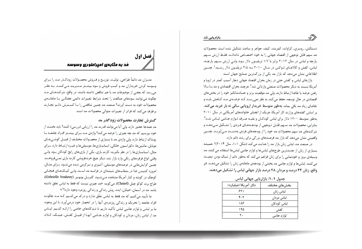 کتاب بازاریابی مد به مدیران براساس آخرین تحقیقات بازاریابی مد، دیدگاههای شرکت مد، بهترین روشها و الگوها و مصاحبه با مصرفکنندگان مد، در تاثیرگذاشتن بر ارزش افزوده مد به محصولات و خلق مشتریان وفادار در بازار رقابتی مد کمک میکند.مباحث کتاب بازاریابی مد بیشتر بفروشید: مد به مثابه ی امیپراطوری وسوسه -مد به مثابه ی دنیای تاثیرات-مد و محصولات متنوع مد-نظارت بر هزینه و قیمت در بازاریابی مد-مد مثابه یک وسیله ی ارتباطی-مدیریت کانال های توزیع و بهبود تاثیرات مد-اهرم ارزش ویژه ی مد به مثابه یک مزیت مطلق